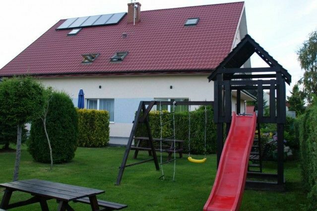 Ogród pięknie zagospodarowane z licznymi nasadzeniem, w ogrodzie znajduje się plac zabaw dla dzieci ze zjeżdżalnią, huśtawka.